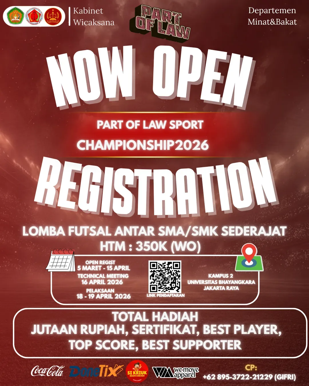 Part of Law Sport Championship 2026 adalah ajang turnamen futsal antar SMA/SMK yang diselenggarakan sebagai sarana kompetisi sehat untuk membentuk karakter generasi muda yang disiplin, sportif, dan mampu bekerja sama, sekaligus menjadi wadah pengembangan bakat, mempererat silaturahmi antar pelajar, serta menumbuhkan semangat kebersamaan dan integritas.